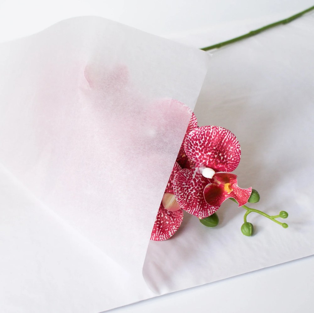 Калька обладает полупрозрачной структурой и лёгкостью, что делает её идеальной для создания воздушных и элегантных букетов. В отличие от бумаги, она не скрывает цветы, а подчёркивает их красоту.