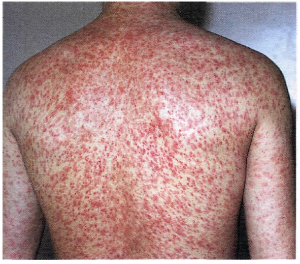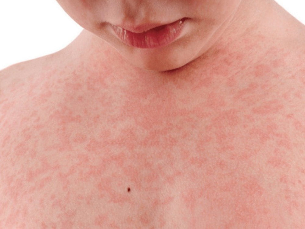 - Дрібнокрапковий висип, без ознак свербежу, зникає через кілька днів.