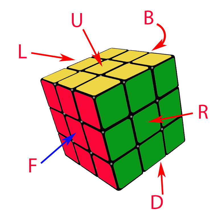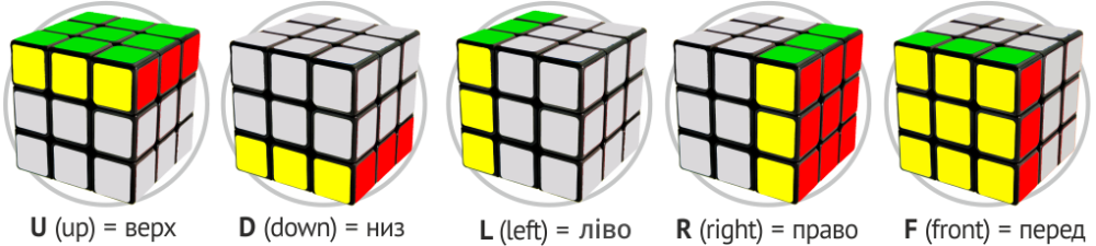 Позначення такі самі, як у 3×3: R, L, U, D, F, B — повороти граней за годинниковою стрілкою, ‘ — проти годинникової, 2 — подвійний поворот. Оберіть колір, з якого почнете (переважно білий). Знайдіть три кутові елементи з білим кольором. Розташуйте їх у нижньому шарі, щоб кольори збігалися з боками. Для встановлення кута використовується базова формула: R U R’ U’. Повторюйте її, доки кут не стане на своє місце.