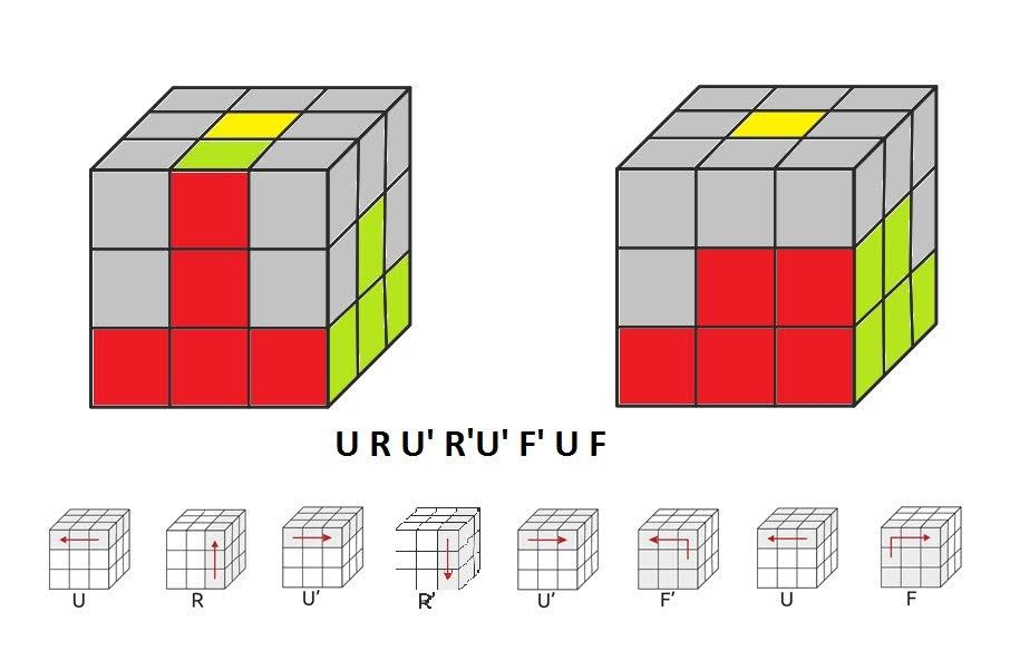 Щоб встановити потрібне ребро у середній шар, знайдіть його на верхньому. Якщо ребро має йти ліворуч, використайте: U’ L’ U L U F U’ F’. Якщо праворуч: U R U’ R’ U’ F’ U F.